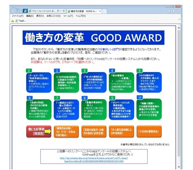 「働き方の変革 GOOD AWARD」に応募された事例は全て、DNPグループ社員がイントラネットで閲覧できるようになっており、好事例を社内に広げる取り組みにつながっています。DNPは今後も、さまざまな事例をヒントに、新しい価値を創出する仕組みの構築や業務の質の向上を目指していきます。