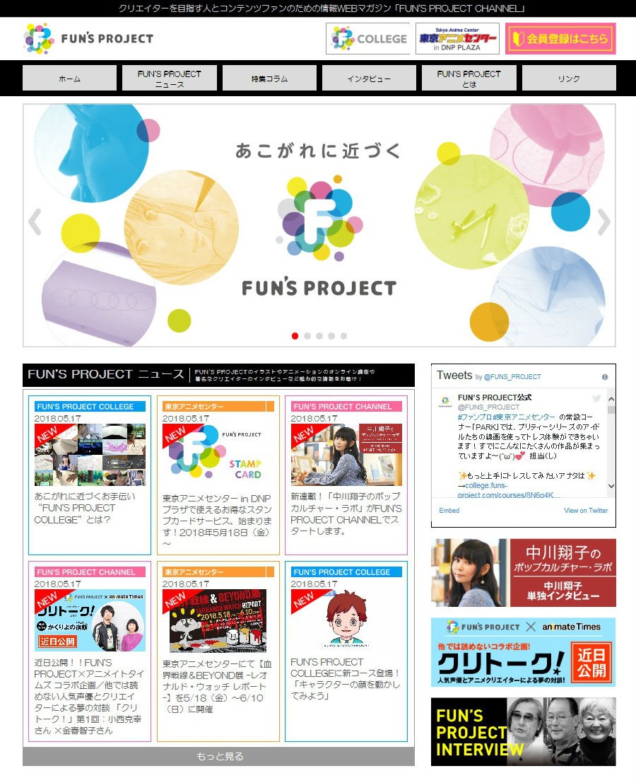 アニメやマンガ、イラストをネットで学べるオンライン配信サービス「FUN'S PROJECT COLLEGE(ファンズプロジェクト カレッジ)」や「東京アニメセンター in DNPプラザ」(東京・市谷)で開催している企画展の情報、液晶ペンタブレットやトレース台を使って無料でクリエイター体験ができる「FUN'S PROJECT PARK」(東京アニメセンター in DNPプラザ内に常設)の情報などをお届けします。