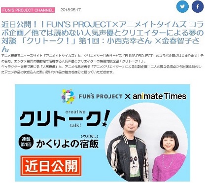 今回、クリエイターを目指す方やコンテンツファンに向けた情報WEBマガジン「FUN'S PROJECT CHANNEL(ファンズプロジェクト チャンネル)」の新企画を5月17日(木)に開始しました。アニメやマンガを中心としたクリエイティブ業界で活躍しているトップクリエイターや人気声優、タレントが登場する、オリジナリティの高いコンテンツを発信していきます。