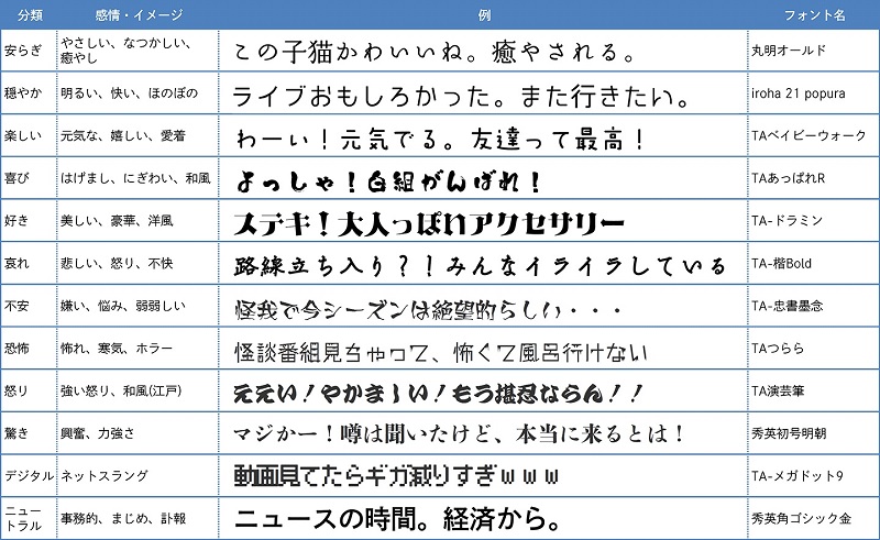 ■参考 : 12種類の感情・イメージの分類と使用フォントの組み合わせ例