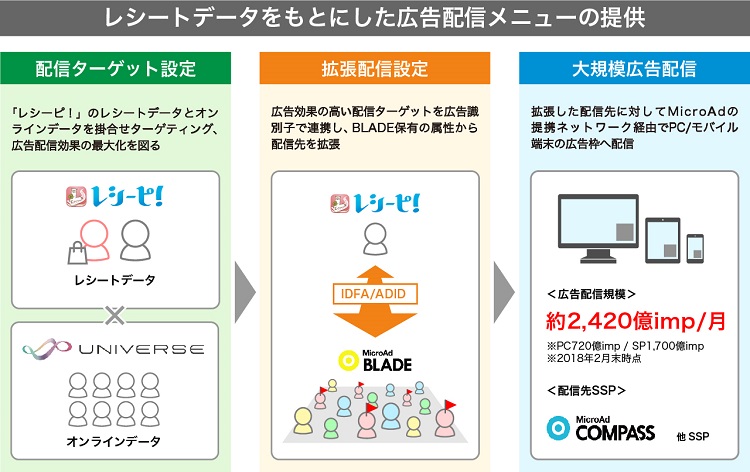 Web広告を出したい企業は、「レシーピ!×UNIVERSE」を利用することで、ターゲットとする属性の生活者に対して、マイクロアドが提携する月間約2,420億インプレッション(広告表示回数)のメディア群への広告配信が可能になります。