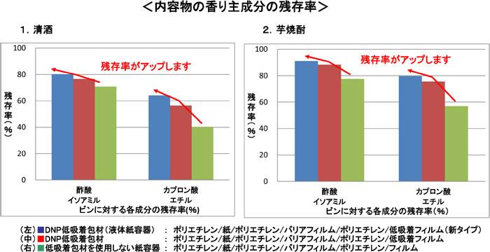 ○清酒と芋焼酎の風味の保持性を確認するため、「DNP低吸着包材(液体紙容器)」「DNP低吸着包材」および「低吸着でない紙容器」で、充填から10日後の内容物の香り成分の残存率を測定し、比較しました。その結果、今回開発した「DNP低吸着包材(液体紙容器)」は、清酒や焼酎の香りの主要成分である酢酸イソアミルやカプロン酸エチルが他の容器に比較して多く残存していることが分かりました。