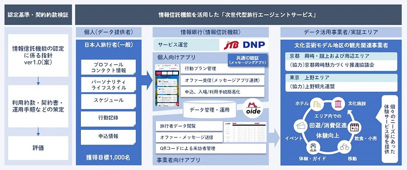 大日本印刷株式会社(本社:東京都新宿区、代表取締役社長:北島義斉、以下:DNP)と株式会社JTB(本社:東京都品川区、代表取締役社長:髙橋広行、以下:JTB)は、旅行者のパーソナルデータを情報銀行(情報信託機能)で集約・活用する「次世代トラベルエージェントサービス」を共同で開発し、東京の上野エリアと京都の岡崎・蹴上および周辺エリアでの実証事業*1を12月に開始します。本サービスは、旅行者がストレスなく最適なサービスを選択・利用するための支援と、地域の観光関連サービス事業者による効果的なデータ活用やサービス提供の両立を目指すものです。