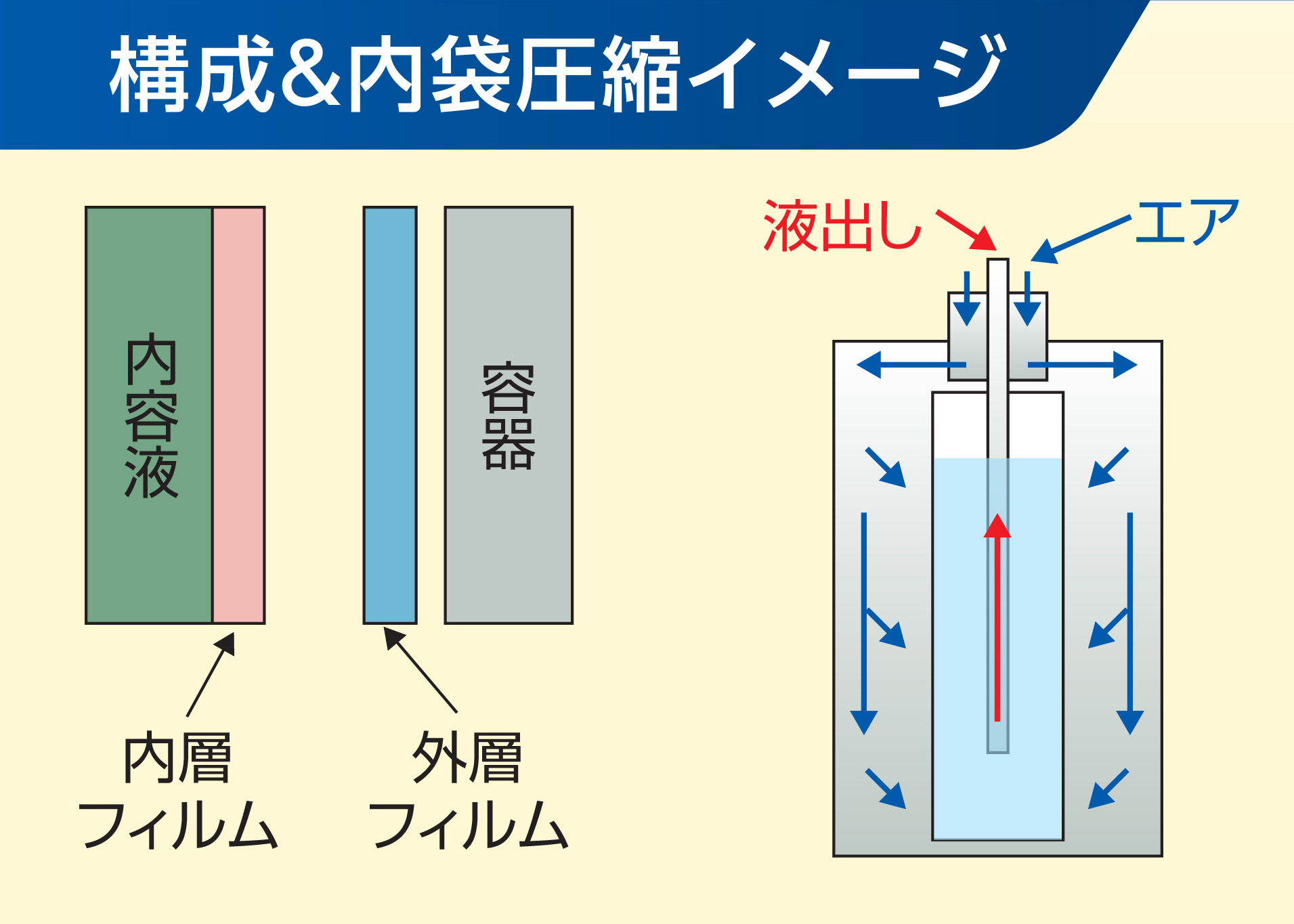 - 輸送容器と内袋の二層構造により、圧力をかけて薬液を取り出す際に容器内の残液を少なくできます。