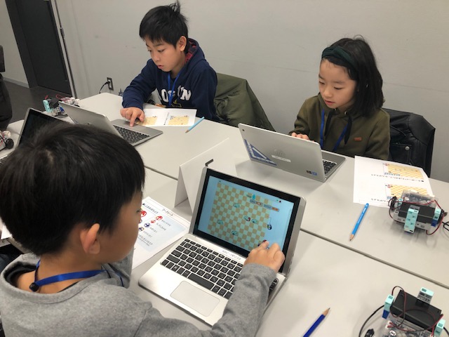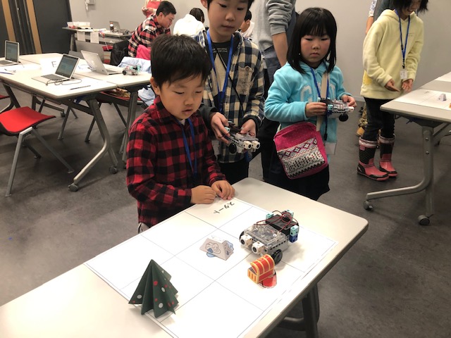 〇参加者は、ロボットが宝箱を探し出していく「宝探しプログラム」を実施しました。宝箱にたどり着くにはどうしたら良いのか、さまざまな方法を自ら考え、コンピューターへの指示を作成しながら、プログラミングの基本的な仕組みを理解します。イベントの後半では、参加者が作成したプログラムによって実際にロボットを動かして、宝箱までたどり着けるどうか挑戦しました。