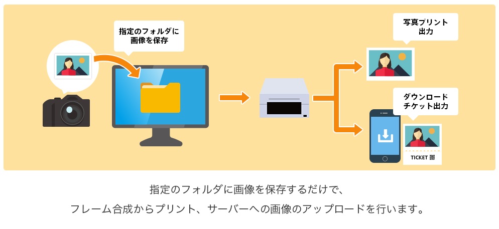 本システムの利用者がアプリケーションをインストールしたパソコン(PC)の指定のフォルダに撮影データを保存する操作をするだけで、20秒程度で、撮影データとフレーム画像が合成され、そのデータがクラウド環境にアップロードされます。その後、写真プリントと写真データのダウンロードができる“チケット”が、DNPの昇華型熱転写プリンターから出力されます*1。また、合成するフレーム画像をアプリケーション内で自由に設定することができます。