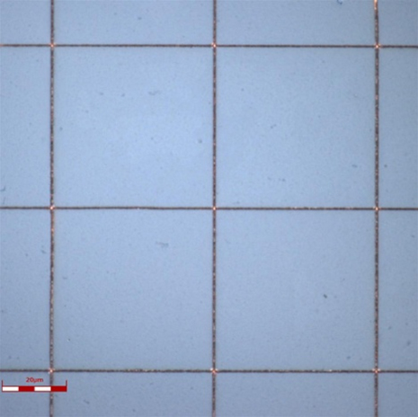 基材となるフィルム上に金属(銅)の超微細パターンを形成しており、線幅を縦横各1μm(100μmピッチメッシュ)以下とすることで、目視では確認できないため、スマートフォン画面の視認性を損ないません。