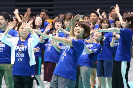 当日は、それぞれの企業から有志の社員および応援に来られたご家族など、あわせて総勢約2,000人が集まりました。ゲストとしてお迎えした公益財団法人東京オリンピック・パラリンピック競技大会組織委員会アスリート委員会の高橋尚子委員長や河合純一副委員長と田口亜希委員、および各企業に所属するアスリート達と一緒に、「綱引き」や「リレー」、オリンピックとパラリンピックの競技の要素を取り入れたオリジナルプログラムに参加し、汗を流し笑顔や感動を共有しました。また、最後は参加者全員で「東京五輪音頭-2020-」を踊りました。