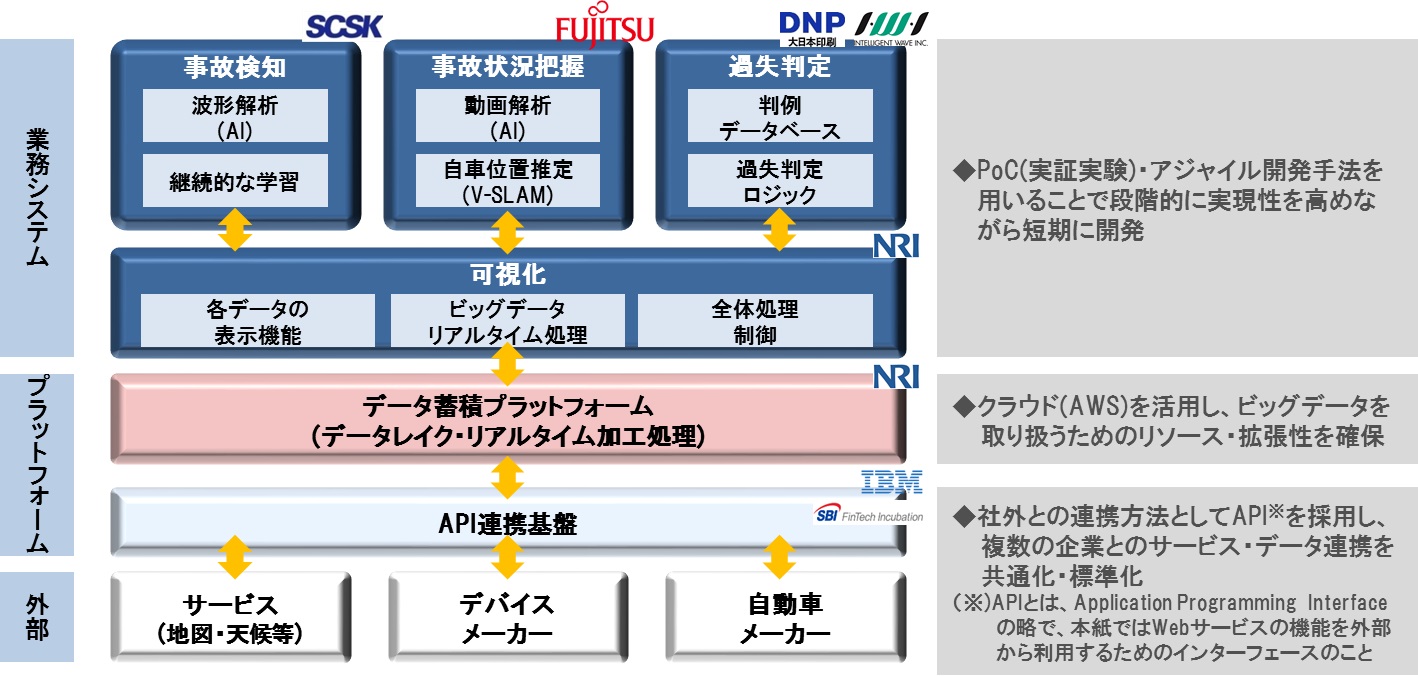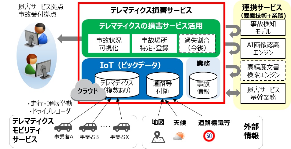 MS&ADインシュアランスグループのあいおいニッセイ同和損害保険株式会社(社長:金杉 恭三)は、テレマティクス※1自動車保険のパイオニアとして、最先端のテレマティクス技術を活用した全く新しい事故対応サービス「テレマティクス損害サービスシステム」を株式会社野村総合研究所(会長兼社長:此本 臣吾)、SCSK株式会社(社長:谷原 徹)、富士通株式会社(社長:時田 隆仁)、大日本印刷株式会社(社長:北島 義斉)、株式会社インテリジェント ウェイブ(社長:井関 司)、日本アイ・ビー・エム株式会社(社長:山口 明夫)、SBI FinTech Incubation株式会社(代表取締役:木村 美礼)と共同で開発いたしました。各社の最新技術とテレマティクス情報を複合して事故対応で実用化する取組みは業界初※2であり、これまでにない革新的かつ高品質な事故対応サービスをお客さまへ提供します。