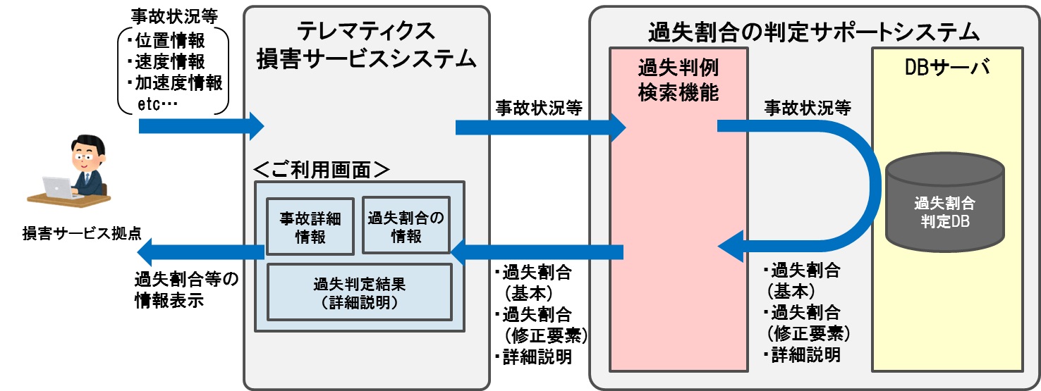 ドライブレコーダーや車両から得られるデジタルデータから再現した事故原因や事故発生時の状況をもとに、DNPおよびIWIの提供する高精度文書検索システム「OpAI」のデータ分析技術を活用し、過去の交通事故判例を自動的に表示し、過失割合を自動判定するシステムを開発いたしました。本システムにより、判例の検索~表示時間を短縮し、基本過失や修正要素を加味した過失割合の判定をサポートすることで、迅速かつより適切な過失・示談交渉を実現します。