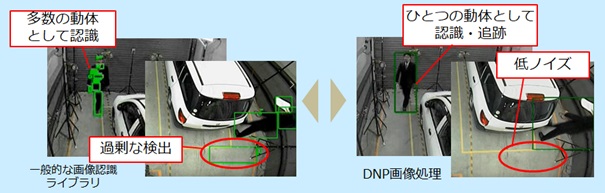 ①注意すべき対象を高精度に検出、表示 : 注意すべき人物や物体の動きを捉え、DNP独自のアルゴリズムで照明の変化、影や映り込みなどの要素の影響を低減して追跡表示します。動きが止まった物についても認識できる機能を実装しており、対象の移動・停止に関わらず継続して追跡します。