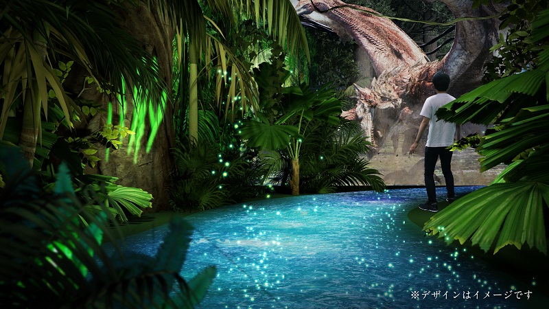 モンスターハンター15周年展の体感エリアでは、「森」、「火山」、「雪山」などの5つのフィールドを出現させ、モンスターハンターの世界を表現しています。プロジェクションマッピングによる360°シアターでモンスターハンターの世界に没入することができるフィールドや、各シーンに合わせた匂いの演出、また4D体験やサラウンド音響など、“モンスターハンターの世界観“や歴代モンスターの気配や迫力を体感できる、モンスターハンターシリーズで初めての体感型企画展となっています。