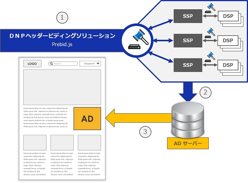 DNPヘッダービディングソリューションは、専用タグをWebサイトのHTMLに組み込み、複数のSSPと公平にオークションを行います。オープンソースプログラムの「Prebid.js」を基盤として機能を提供しているため、Prebid.jsに対応している多くのSSPと接続可能で、標準搭載している複数の有力なSSPとともに、ヘッダービディングのオークションを活性化することができます。
