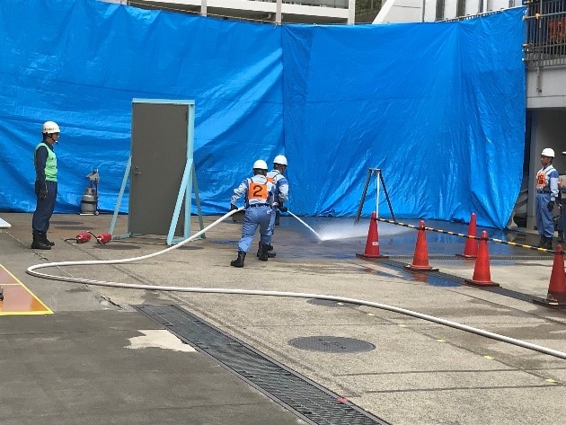 DNPグループ市谷地区の各事業所では、毎年地震や火災を想定した防災訓練を実施しており、多くの社員が勤務する事務所で火災が発生した場合の極めて重要な初期消火に備え、自衛消防組織に基づく初期消火班や若手社員を中心とした約2か月半に及ぶ訓練を実施しています。