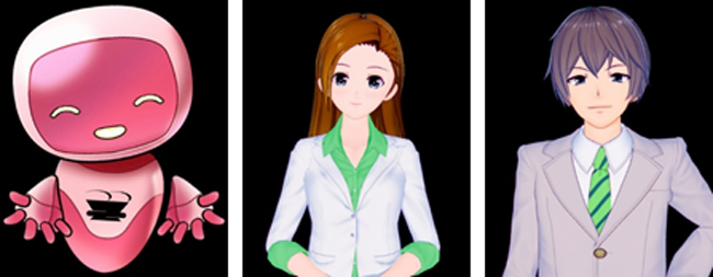 バーチャルキャラクター : ロボットスタッフ(左)、女性スタッフ(中央)、男性スタッフ(右)