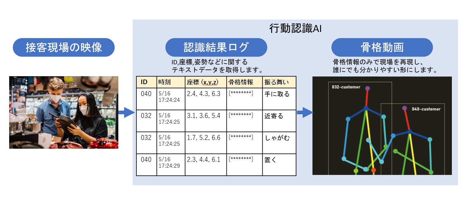 また、個人情報保護の観点から、撮影した売場の映像を骨格情報の数値に置き換えて収集しています。これを視覚的・直観的に理解しやすい骨格動画に再現することで、誰にでもわかりやすい形にし、売場の状況や課題の可視化につなげます。