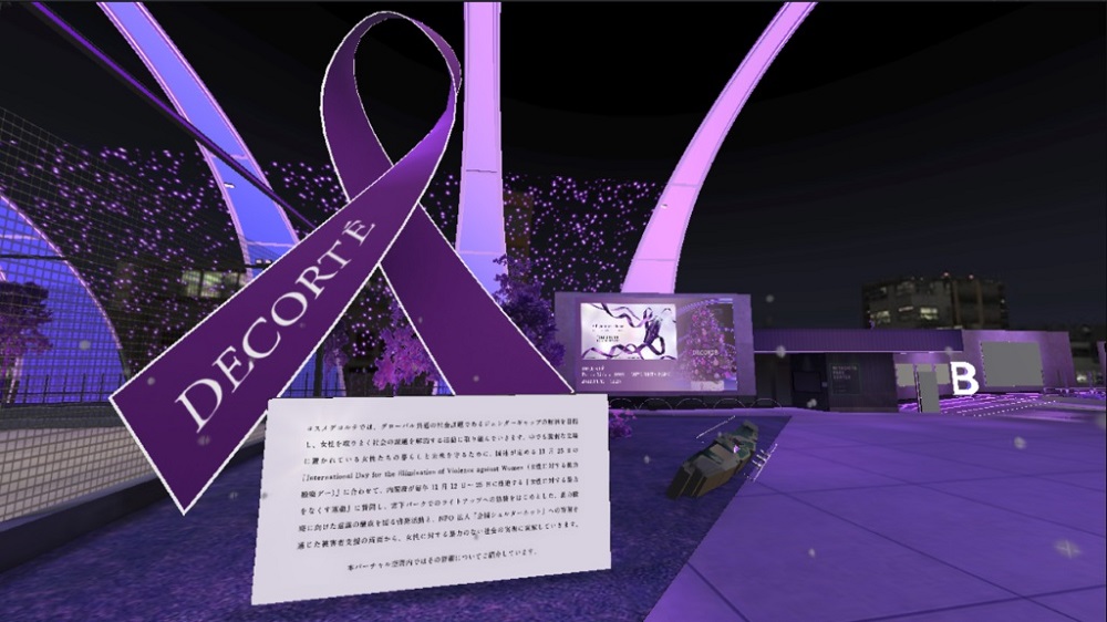 イベント期間に「渋谷区立宮下公園 Powered by PARALLEL SITE」でパープル・ライトアップを行い、利用者はバーチャル空間を散策しながら、各エリアでパネル掲載するパープルリボンプロジェクトの取り組みや、点灯式、イルミネーション装飾を楽しむことができます。また、渋谷区公認の配信プラットフォーム「バーチャル渋谷」でも「DECORTÉ Purple Lightup 2022」を実施し、巨大なパープルリボンが登場するVRフォトスポットを設置します。各空間の相互送客を図り、複数のメタバースが連動したイベントを実施することで、女性に対する暴力排除の意識や理解度の向上を目指します。渋谷を拠点とした複数のインターネット上の仮想空間・メタバースで同時に同じイベントを行うのは初めての試みです。