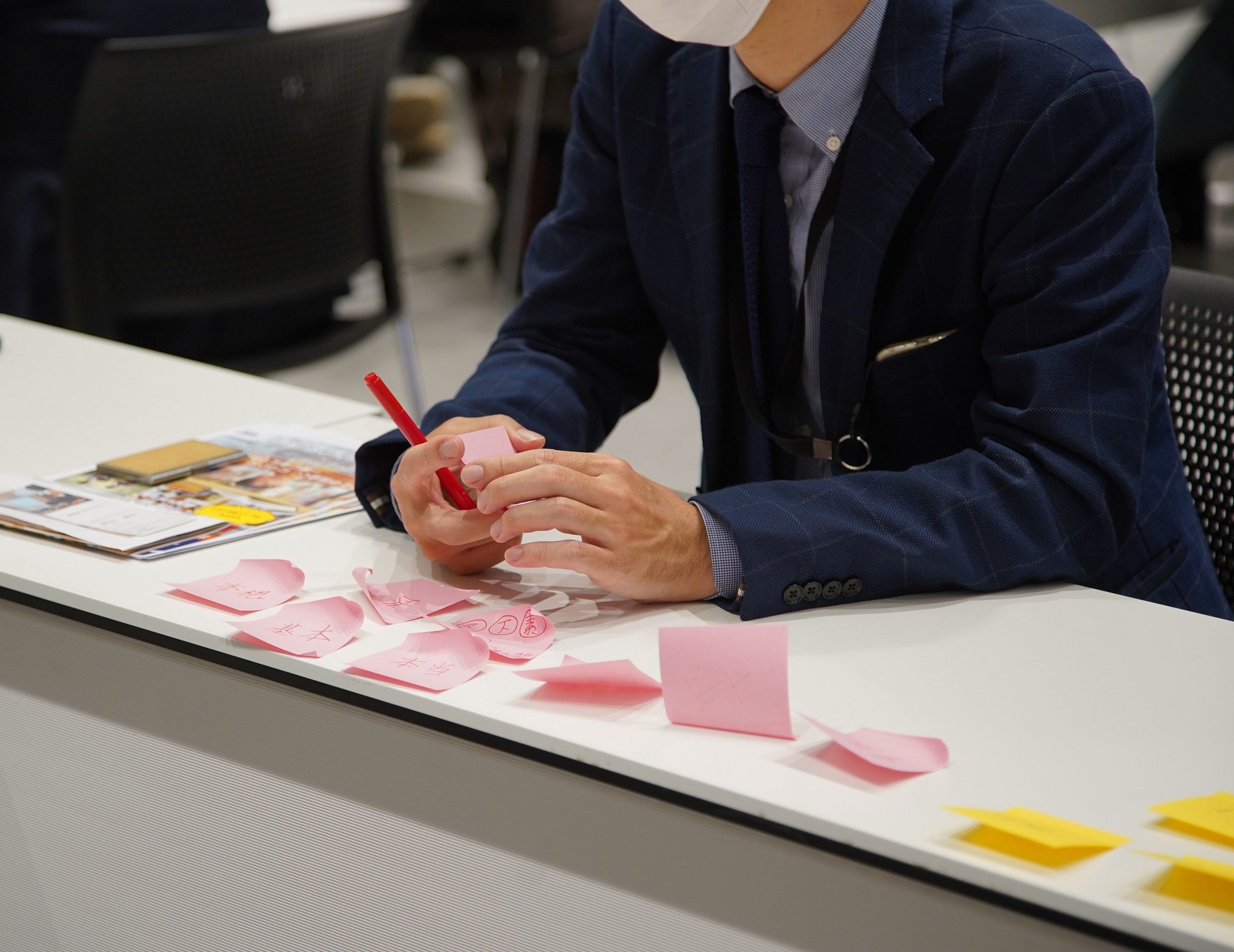 丸善CHIホールディングスグループの株式会社編集工学研究所が開発した「目次読書法」を用いて、参加者が本の「帯」をつくるワークショップを開催しました。「帯」は、書店等で目につくように、魅力などを記載して本の表紙の下部に巻く細い紙です。今回、情報の見方や関係の見つけ方に着目し、発想力や思考力の向上につなげる「目次読書法」を利用し、参加者は自分で選んだ1冊の新書の目次からキーワードを見つけ、短時間で内容をつかんでキャッチコピーと要約を書いて、本の「帯」を作成しました。このワークショップで作成した「帯」が実際に巻かれた本は、丸善ジュンク堂書店が運営する横浜市庁舎2階の「丸善 HAMARU ラクシス フロント店」で展示・販売しています。