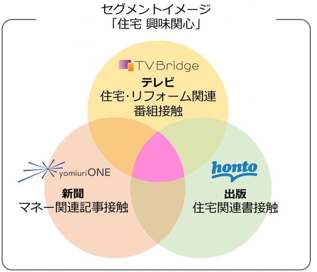 読売新聞グループの新聞読者をベースとした420万IDのデータ基盤「yomiuri ONE」*1と、SMNが活用可能なインターネット接続テレビ約900万台の視聴データ「Connected TV Data Bridge(「TVBridge」)」*2が既に連携しており、ここに今回、会員数760万人のDNPグループのハイブリッド型総合書店「honto」*3のアクセスデータを新たに連携させます。これにより、出版物(雑誌等)・新聞・テレビの3種類のマスメディアを横断するデータマーケティングを実現します。