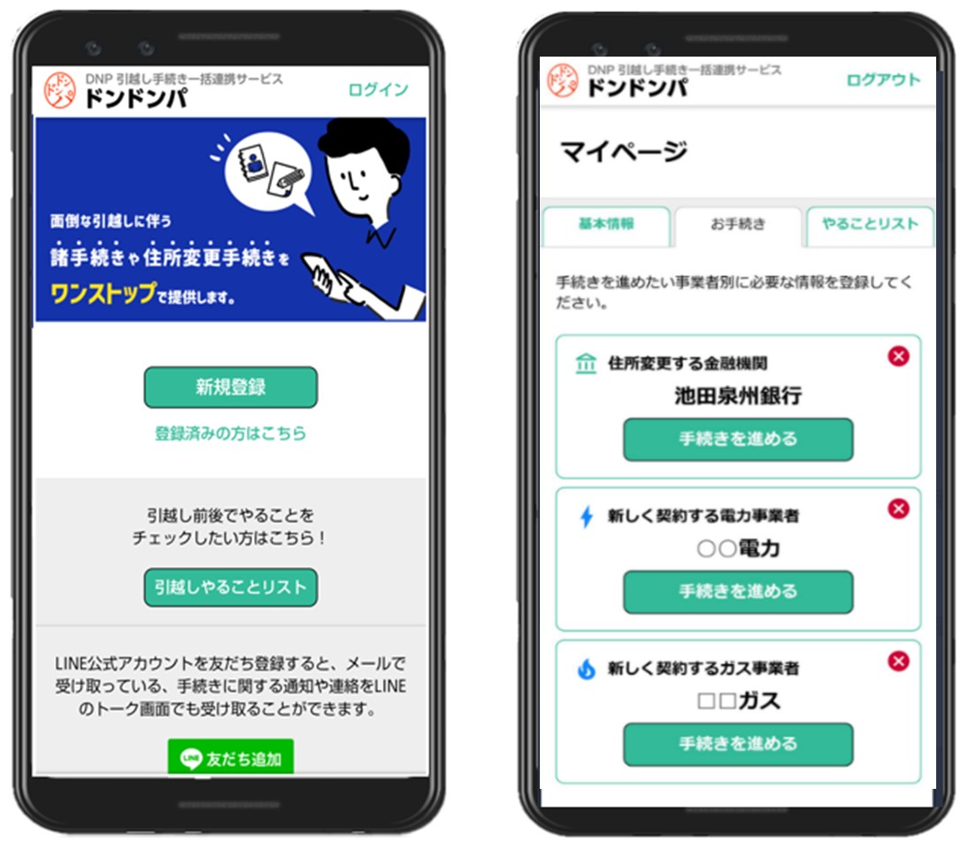 大日本印刷株式会社(DNP)は、引越し時に電気・ガス等のライフラインの開始・停止手続きを一括で行える「DNP引越し手続き一括連携サービス ドンドンパ🄬」*1に、銀行口座の住所変更も同時に行える機能を追加します。このサービス強化により、生活者の引越し手続きの負荷をさらに軽減するとともに、金融機関の住所変更手続きの負荷も軽減し、継続的な顧客管理を支援します。この新機能の第1弾として2023年1月30日(月)に、「ドンドンパ」から株式会社池田泉州銀行*2の住所変更手続き画面へのリンクを開始しました。*3