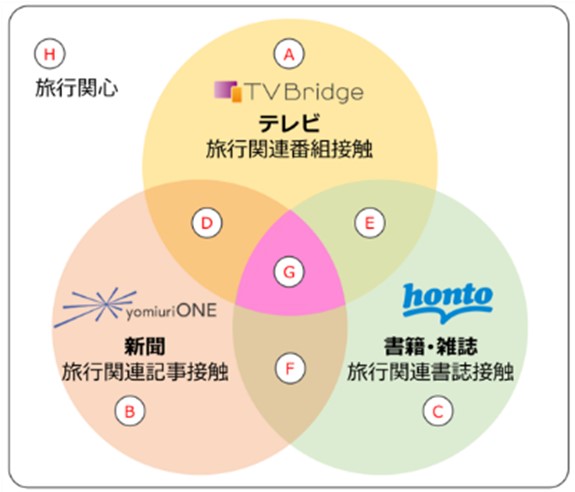サービス開始に先立って実施したテスト配信では、旅行会社の広告配信キャンペーンにおいて、「honto」アクセスデータと「yomiuri ONE」、「TVBridge」の掛け合わせパターンに応じて、A〜Gの7つの配信セグメントを設定し、マス媒体接触データを使用しない場合(H)と比較した広告配信の効果を検証しました。主な結果は以下のとおりです。