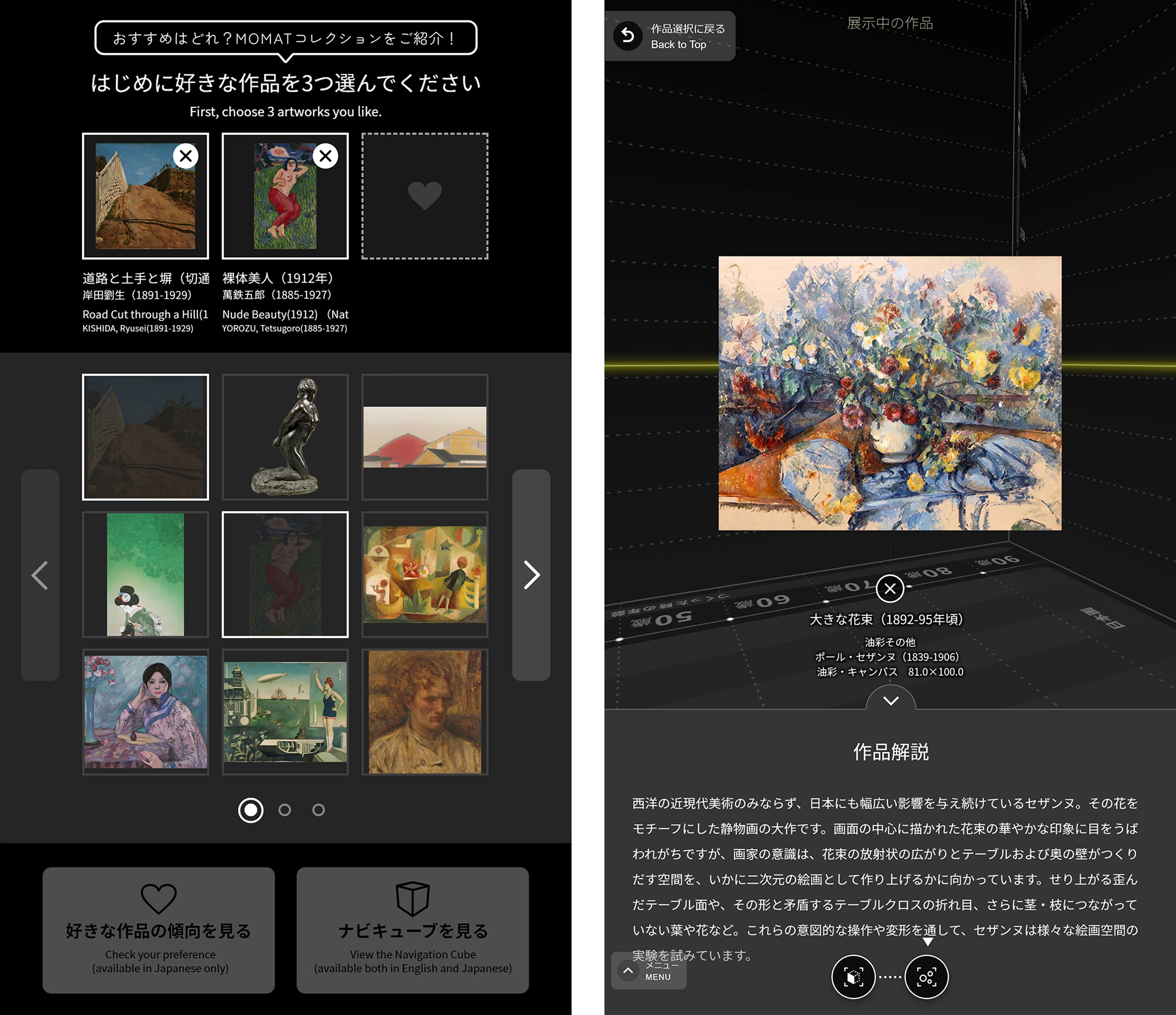 「MOMATコレクション ナビキューブ」の診断画面(左)とナビキューブ(右)画面イメージ