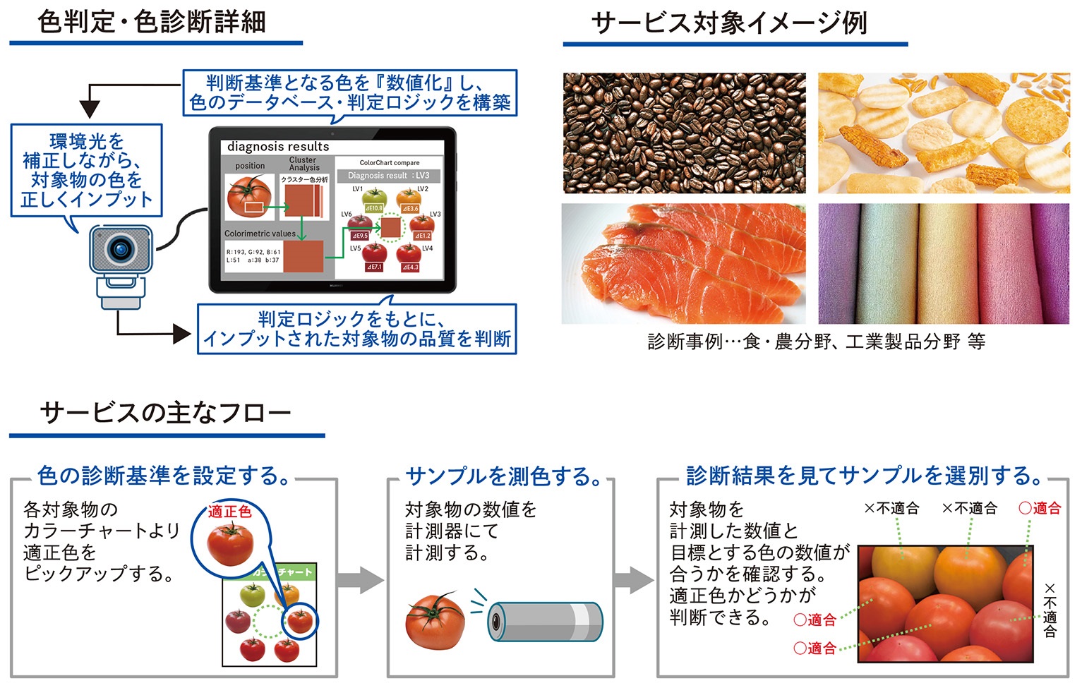 - サンプル製品等の色調の優劣(対象物の色が合っているかどうか)について、即時の判断を可能にします。また、人の目や経験に依存していた色の判定をデジタル化することによって、品質の平準化を図ります。