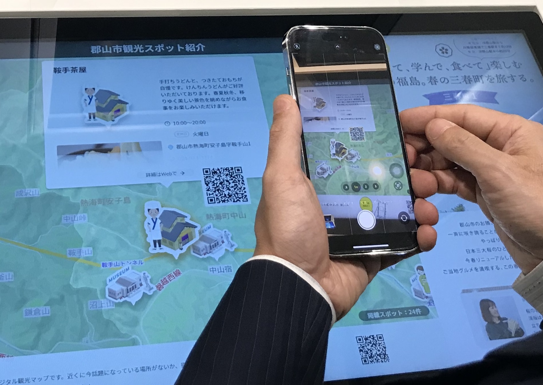 各観光地が運用している公式SNSに掲載された情報等をサイネージ画面の地図上に表示します。郡山市内の約150か所の観光情報を中心に、リアルタイムな地域・店舗・イベント等の情報を提供し、地域を訪れる人々が観光や食事・買い物等を楽しむためのより良い選択肢を提供します。これらの情報は、案内所内のサイネージだけではなく、利用者のスマートフォンでも見ることが可能で、サイネージに表示されたQRコードを読み取ることで、情報を「持ち帰る」ことができます。観光地へ向かう途中や旅行中(旅ナカ)、旅行後(旅アト)などにおける継続的なコミュニケーションを促します。