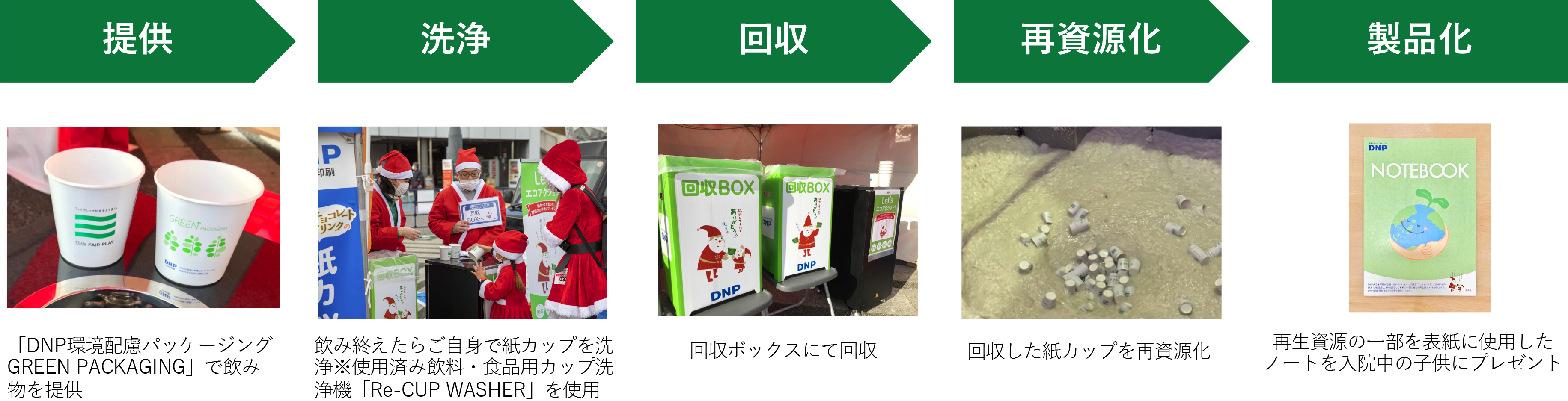 大日本印刷株式会社(DNP)は、持続可能な循環型社会の実現を目指す取り組みの一つとして、2022年12月3日(土)に行われた「東京グレートサンタラン2022」*1の会場でドリンクを来場者に提供し、来場者自身が飲んだ後の紙カップを洗浄して回収する“参加型エコアクション”を実施しました。この時に回収した紙カップを資源として再生し、それを材料の一部としてオリジナルノートを作成して、今回、榊󠄀原記念病院、聖マリアンナ医科大学病院、慶應義塾大学病院で闘病中の子どもたちにプレゼントしました。