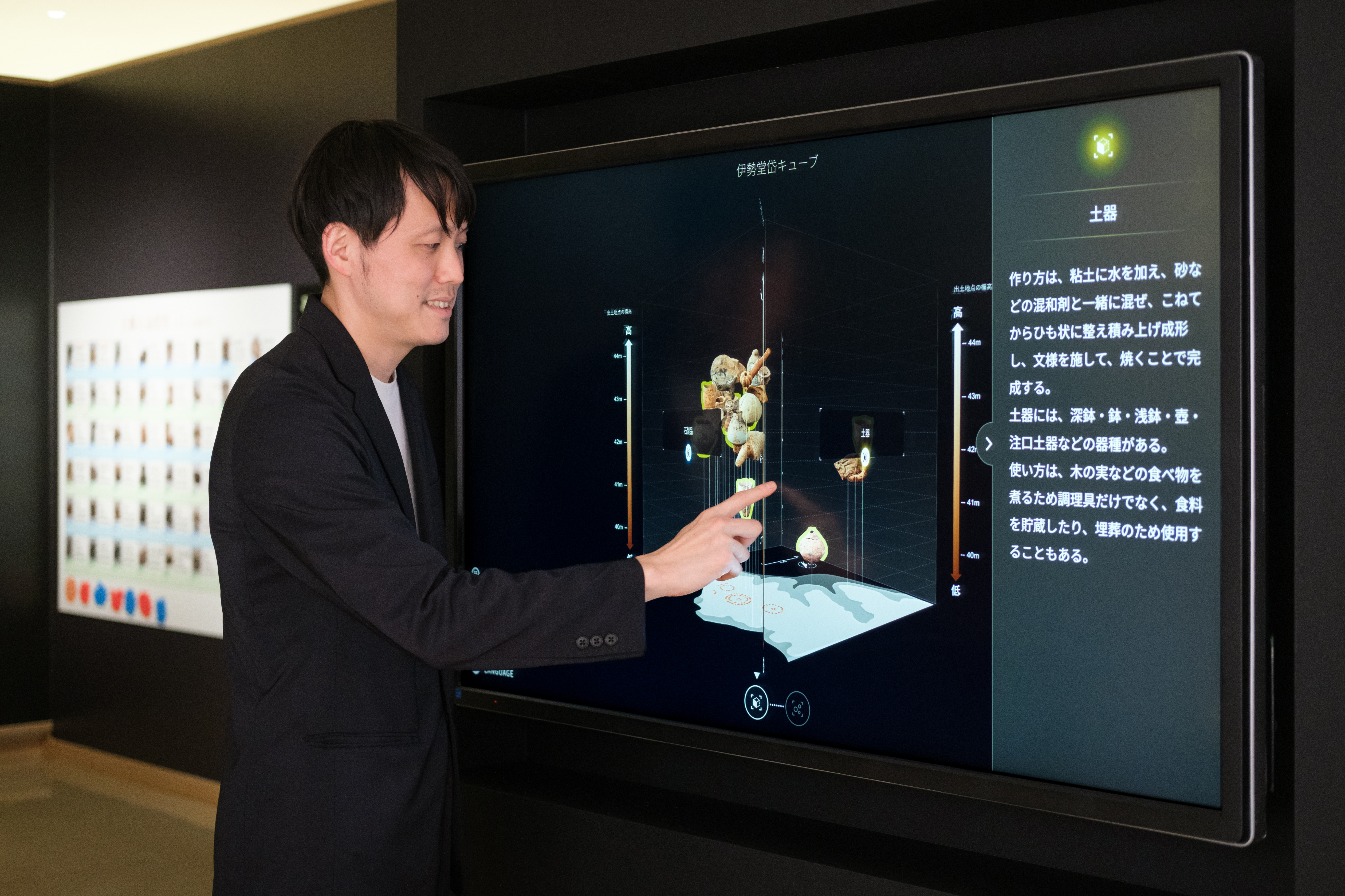 画面上のキューブ型のインタフェースを操作して、多くの出土品が発見された場所・深さを見ることができます。出土品同士の位置的なつながりや積み重ねられた歴史が視覚的に感じられます。画面上で出土品を選択することで、詳しい解説を閲覧できます。本システムはオンラインでもご利用いただけます。