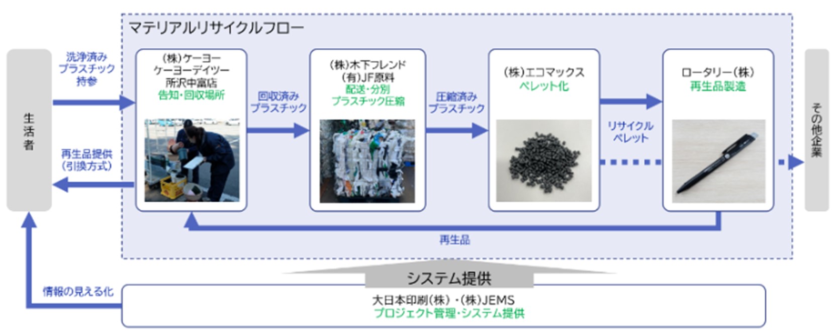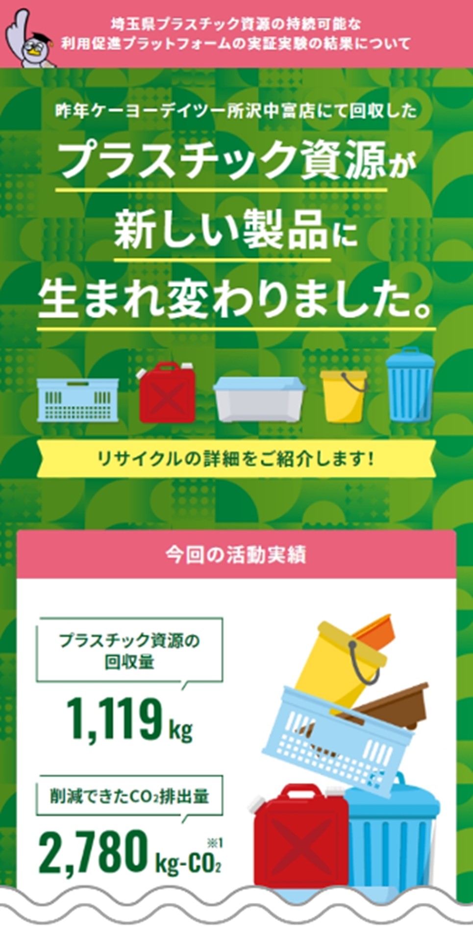大日本印刷株式会社(DNP)は、埼玉県の「プラスチック資源循環の見える化」の実証実験に、民間企業7社の1社として2022年11月から取り組んでいます*1。生活者から回収した資源をリサイクルする過程でのCO₂排出量等を可視化して発信するとともに、それによる生活者のリサイクルに対する意識変容の効果を検証しました。今回、プラスチック資源の店頭回収から、再資源化、再生した資源を活用し製品化するまでの全工程の情報を集約して数値化し、Webサイトで広く公開しました*2。
