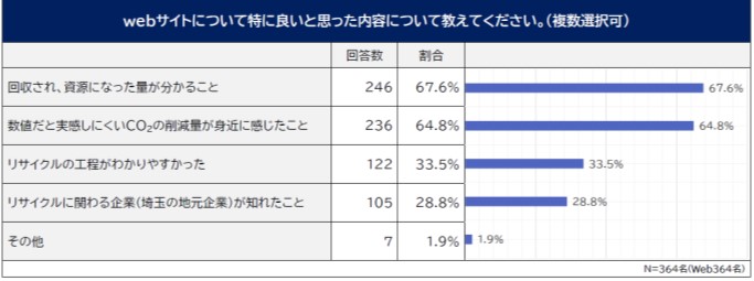 Webサイトにアクセスした人を対象に行った意識調査では、「回収に出したものがちゃんと再利用されていることが確認できた」「数値だと実感しにくい削減量が身近に感じられた」など、約9割の生活者から好意的な回答を得ることができました。リサイクル工程を可視化して情報を開示することは、生活者の前向きな行動変容に効果的であると分かりました。