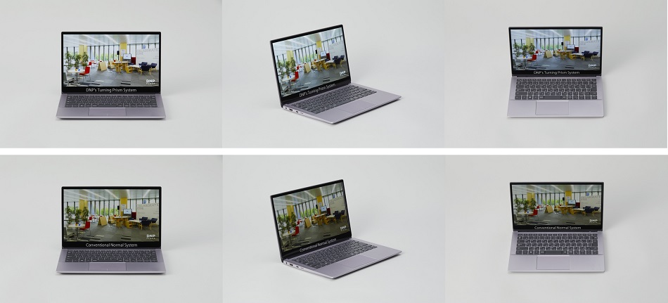 「DNPの“新設計システム部材”を搭載したノートパソコン(上)」と「従来のノートパソコン(下)」の輝度・視野角の比較