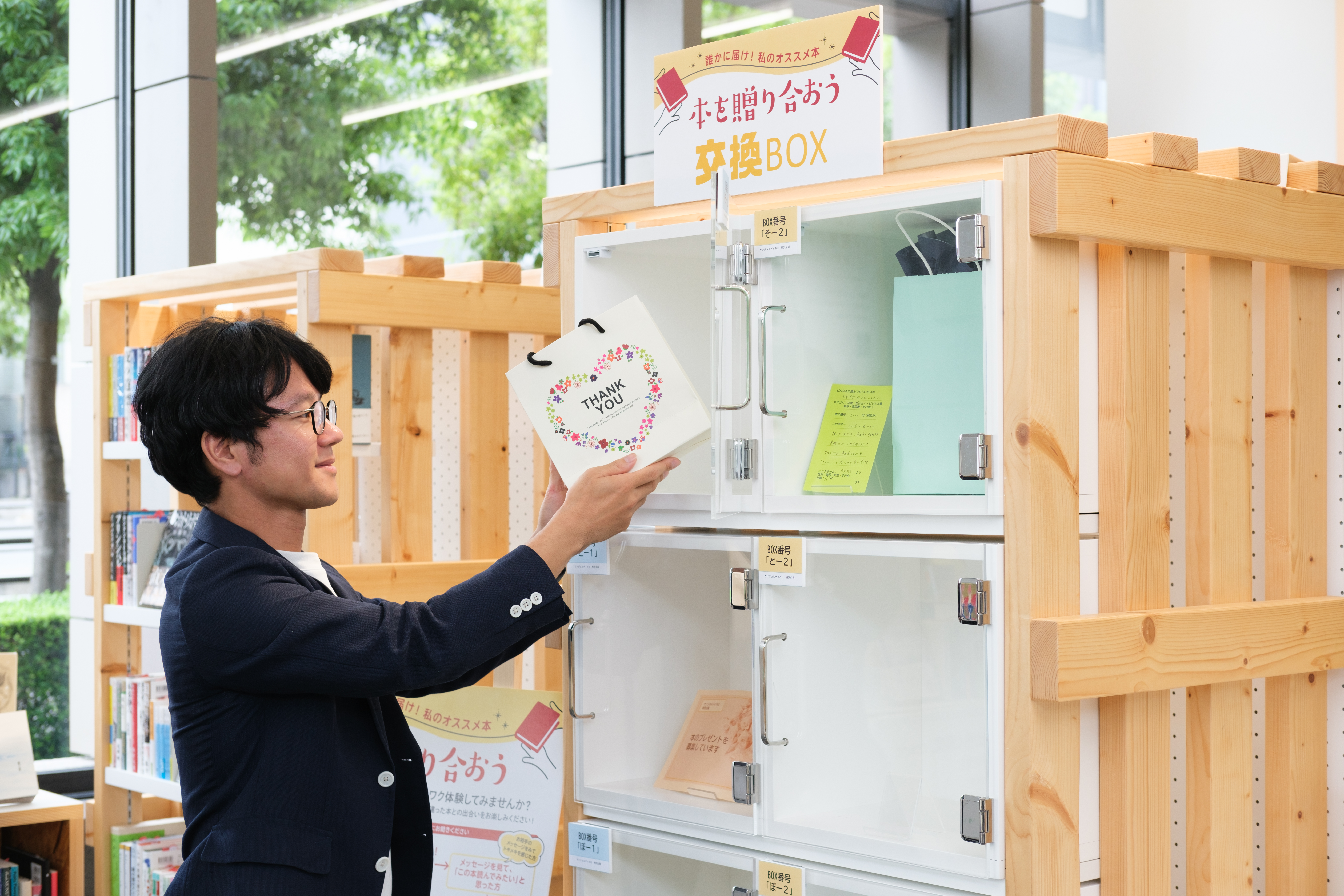 - 「DNPプラザ」*1(東京・市谷)にある外濠書店では、4月24日~6月12日に来店者参加型の「本を贈り合うコーナー」を設置しました。来店者が外濠書店で購入した本を「おすすめのコメント」を添えて専用ボックスに入れ、代わりに他の来店者がそのボックスに入れた本を持ち帰るという仕組みです。