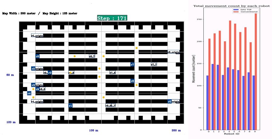 左:シミュレーションのイメージ、右:各ロボットの移動距離を示したシミュレーション結果(10台のAMRすべてにおいて、従来の手法と比べて移動量が下回っていることが確認できる)