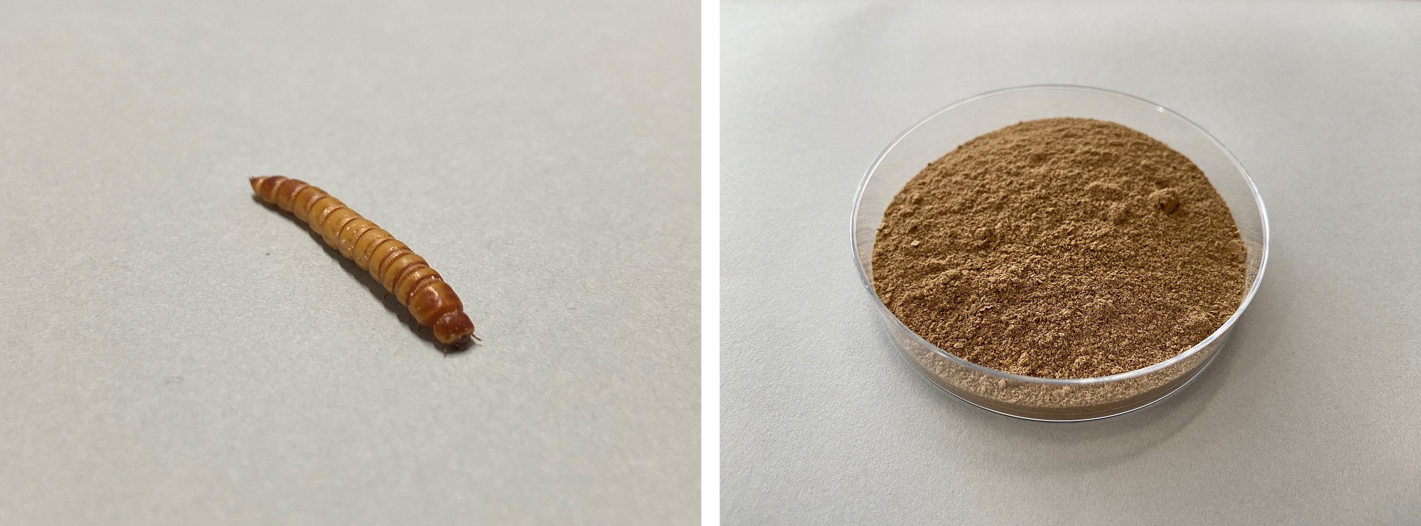 乾燥ミールワーム(左)と飼料として使われるミールワームの粉末(右)