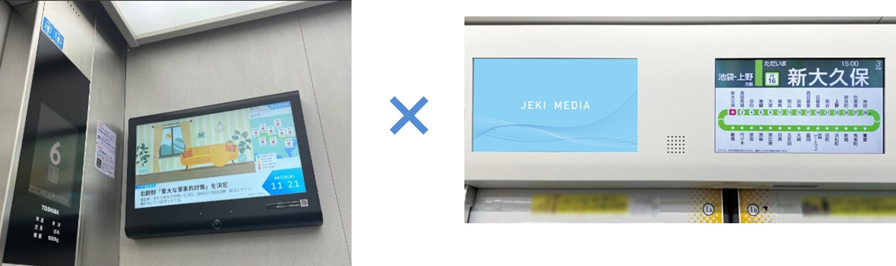 エレベーター内(左)と鉄道車両内(右)のデジタルサイネージの広告枠を組み合わせて提供