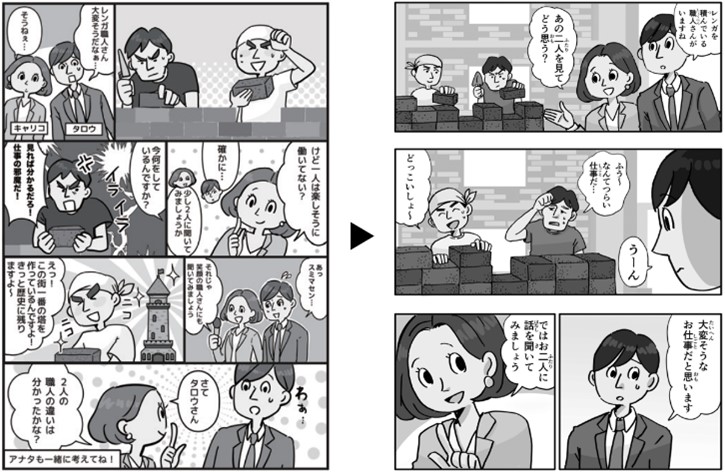 コニカミノルタウイズユーの人事制度の説明資料について、従来のテキスト主体の資料をベースに、通常のマンガと、吉村教授監修による「LLマンガ」の二種類を制作しました。この二種類のマンガを知的障害や精神障害を抱える同社のメンバーに読んでもらい、理解度を検証したところ、参加者の約86%が「LLマンガ」の方が「よりわかりやすい」と評価しました。