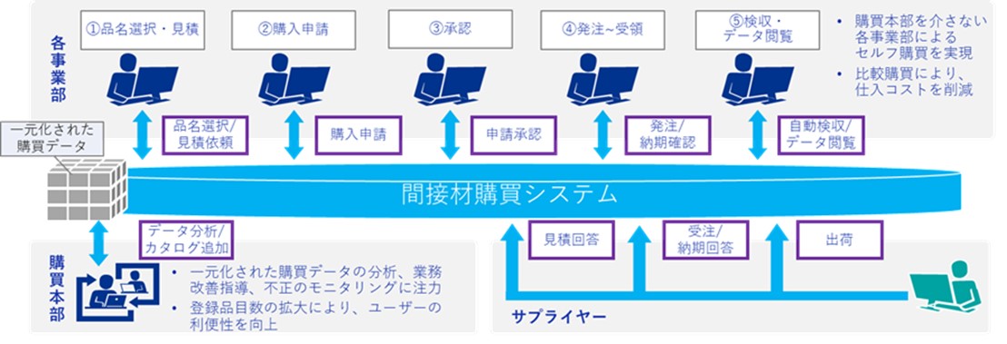 DNPは、複数の社内システムのDX(デジタルトランスフォーメーション)化を進め、DNPグループ内と協力会社の業務効率化やテレワークの推進、ガバナンス強化などに取り組んでいます。これらの取り組みの一環として今回、各種間接材の発注業務(商品検索・見積・承認・発注・検収等)を対象とした新たなシステムを導入し、購買部門のDXをさらに強化しました。
