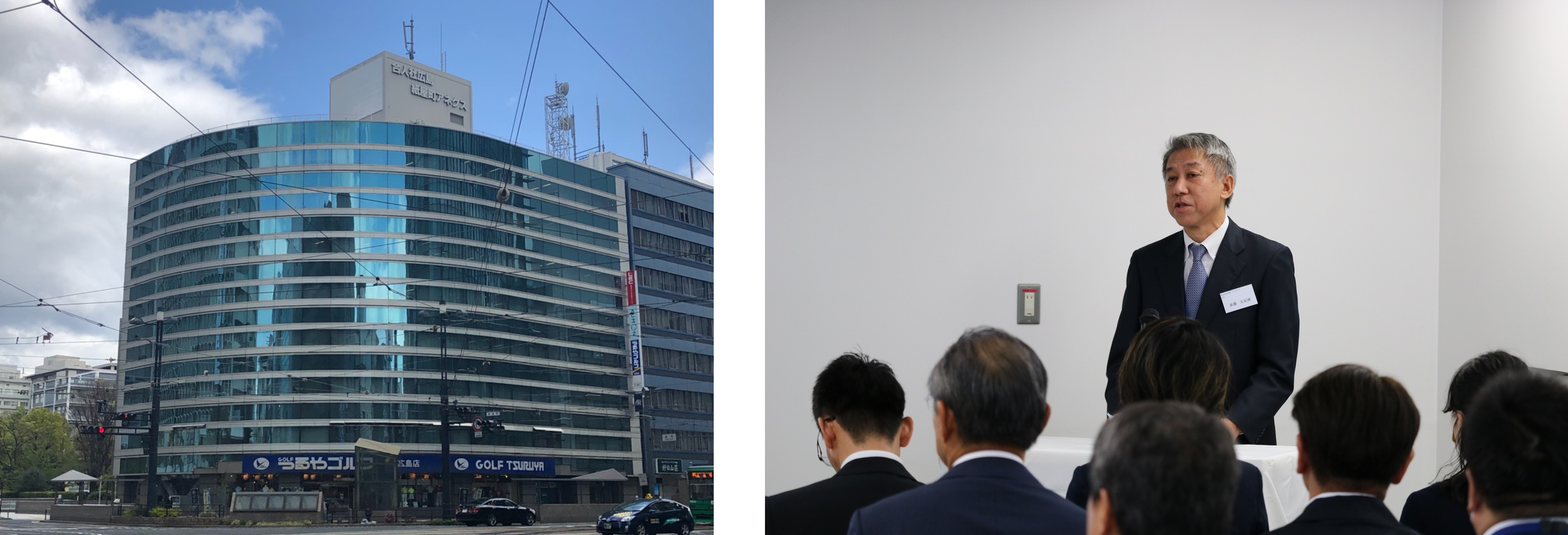 新設した広島市のBPO拠点の外観(左)、 10月2日に行った開所セレモニーの様子(右)