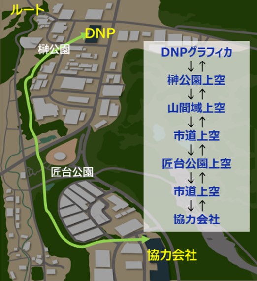 大日本印刷株式会社(DNP)グループの株式会社DNPグラフィカは、自社の印刷工場がある兵庫県小野市の協力のもと、ドローンを利用した新しい社会のインフラづくりにつながる実証実験を2023年10月11日(水)に実施しました。今回、DNPグループの協力会社に対して、定期的に輸送している資材等をドローンで送るなど、5つのテーマの実証を行いました。