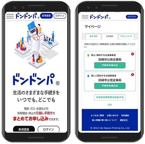 大日本印刷株式会社(DNP)と尼崎市公営企業局は、「DNP引越し手続き一括連携サービス ドンドンパ®」*1を活用し、引越しにともなう尼崎市内の水道の利用開始・停止(開栓・閉栓)の申し込み手続きをオンラインで一括して行うサービスを、2023年10月30日(月)に開始しました。