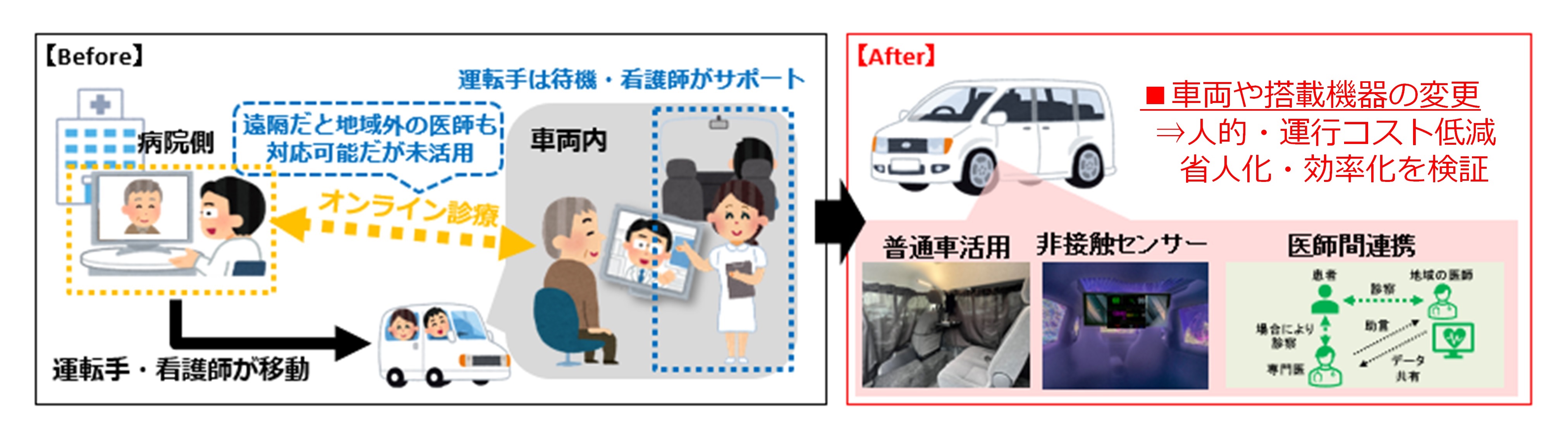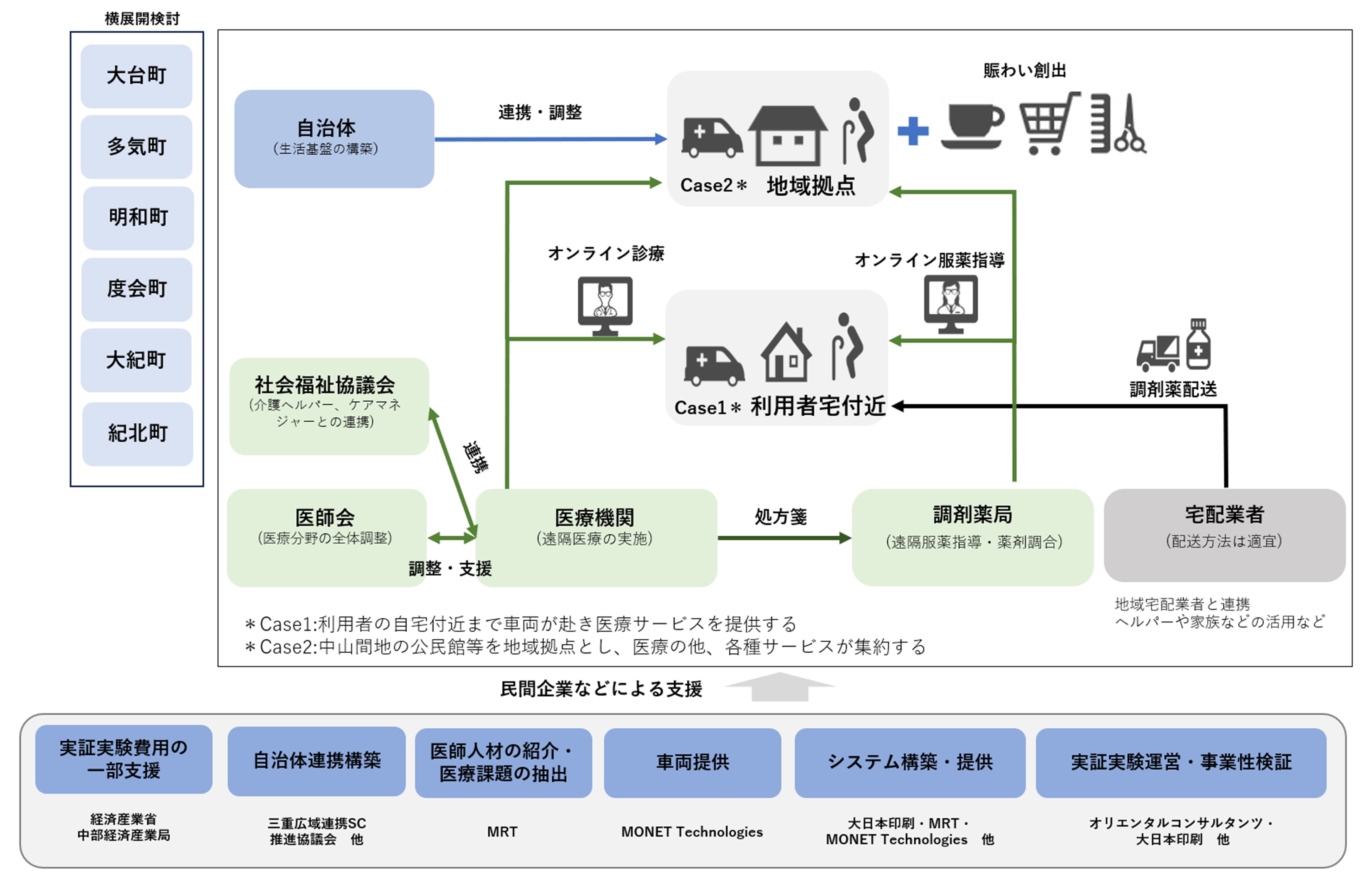 具体的には、「医療MaaSの省人化・効率化(医療MaaSのさらなる深化)」については、過年度の実証実験の評価等を踏まえ、三重県大台町や近隣地域(自治体)をフィールドに、普通車の活用や機器の高度化、医師間連携の視点で検証します。また、「車両を活用した中山間地での地域拠点形成」については三重県度会町をフィールドに、中山間地近くの公共施設等を地域拠点とし、現状中心市街地まで走らせている公共交通機関の代替えとして、買い物、医療など生活に必要なサービスを集め、地域拠点までの移動をサポートすることで、地域の賑わいの創造と公共交通の再構築の可能性を検証します。