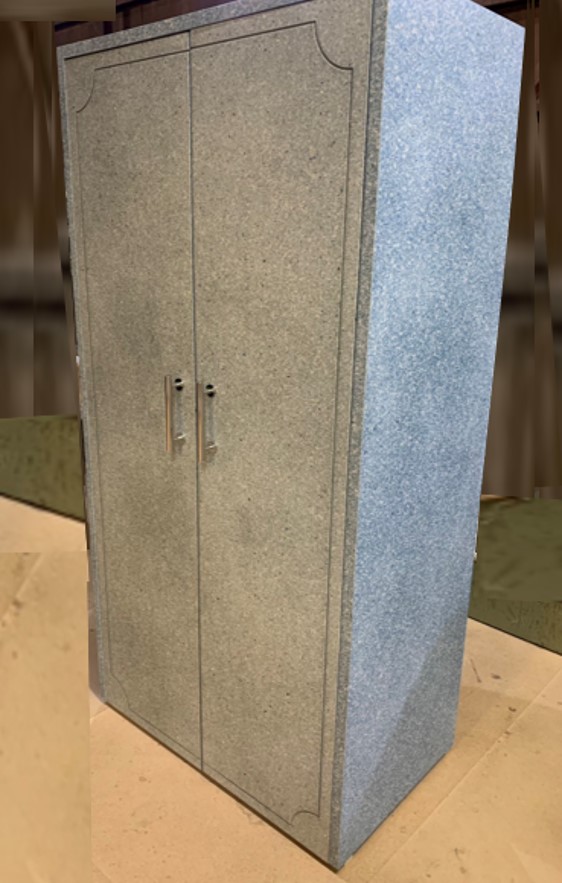 - ワードローブは、原材料となる作業着と牛乳パックをそれぞれ粉砕し、DNPの工場廃紙を粉砕したものと混ぜ合わせ、圧縮・成形して作成しています。サイズは幅900×高さ1800×奥行き550mmで、20kg程度の衣服が収納できます。従来から提供している繊維リサイクルボードと同等の強度があります。