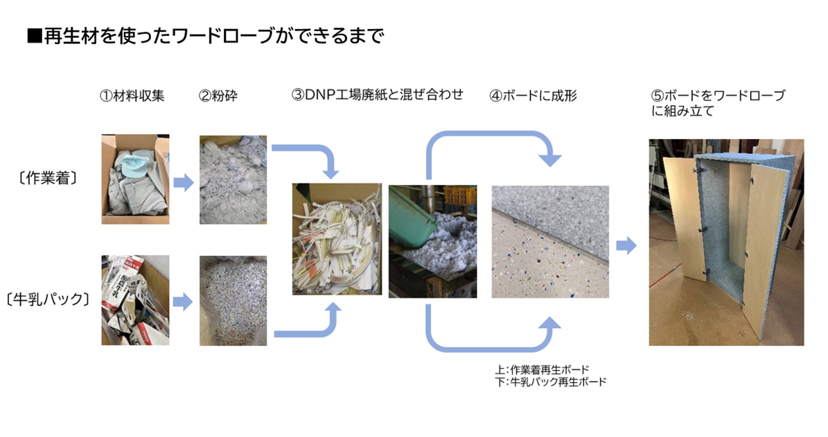 - DNPグループは、工場の廃材や廃棄衣料品等を加工した再生素材を活用してリサイクルボードを制作し、その特長を活かしたPOPや什器などをデザインして提供しています*4。そうした実績とノウハウを活かして今回、埼玉県職員の作業着と県内給食でも提供されている森乳業株式会社の牛乳パックを再利用してリサイクルボードを作成し、ワードローブに成形しました。