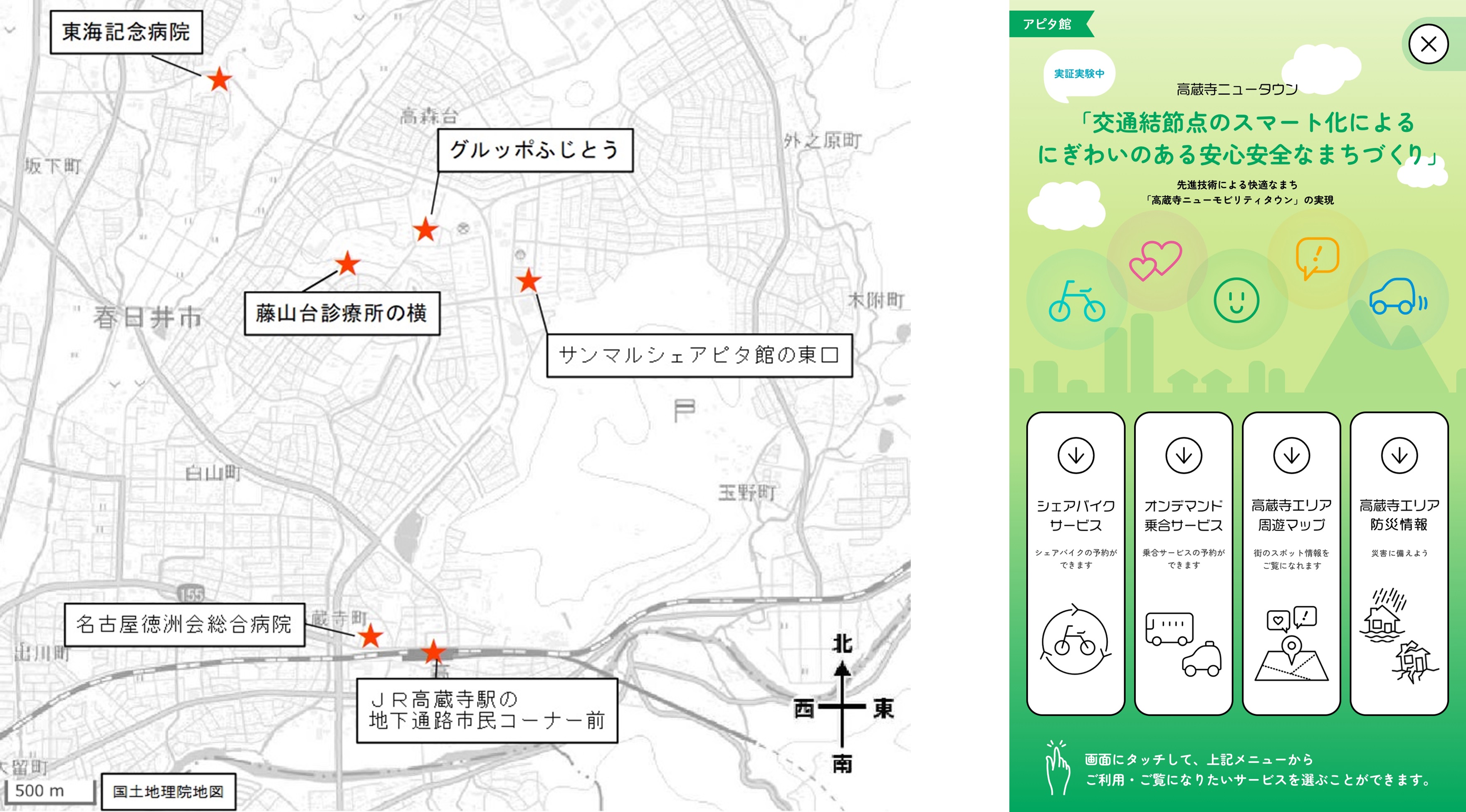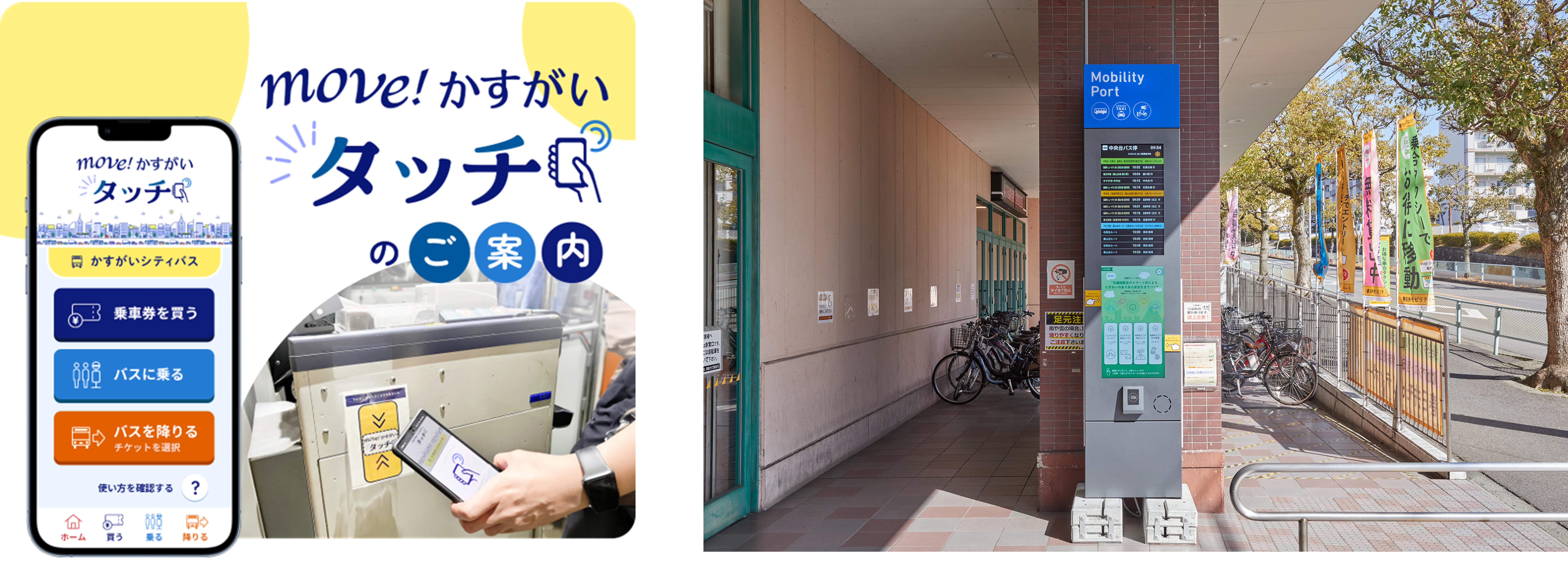 MaaSアプリ「move!かすがいタッチ」(左)、2022年度にアピタ館東口に設置したモビリティポート(右)