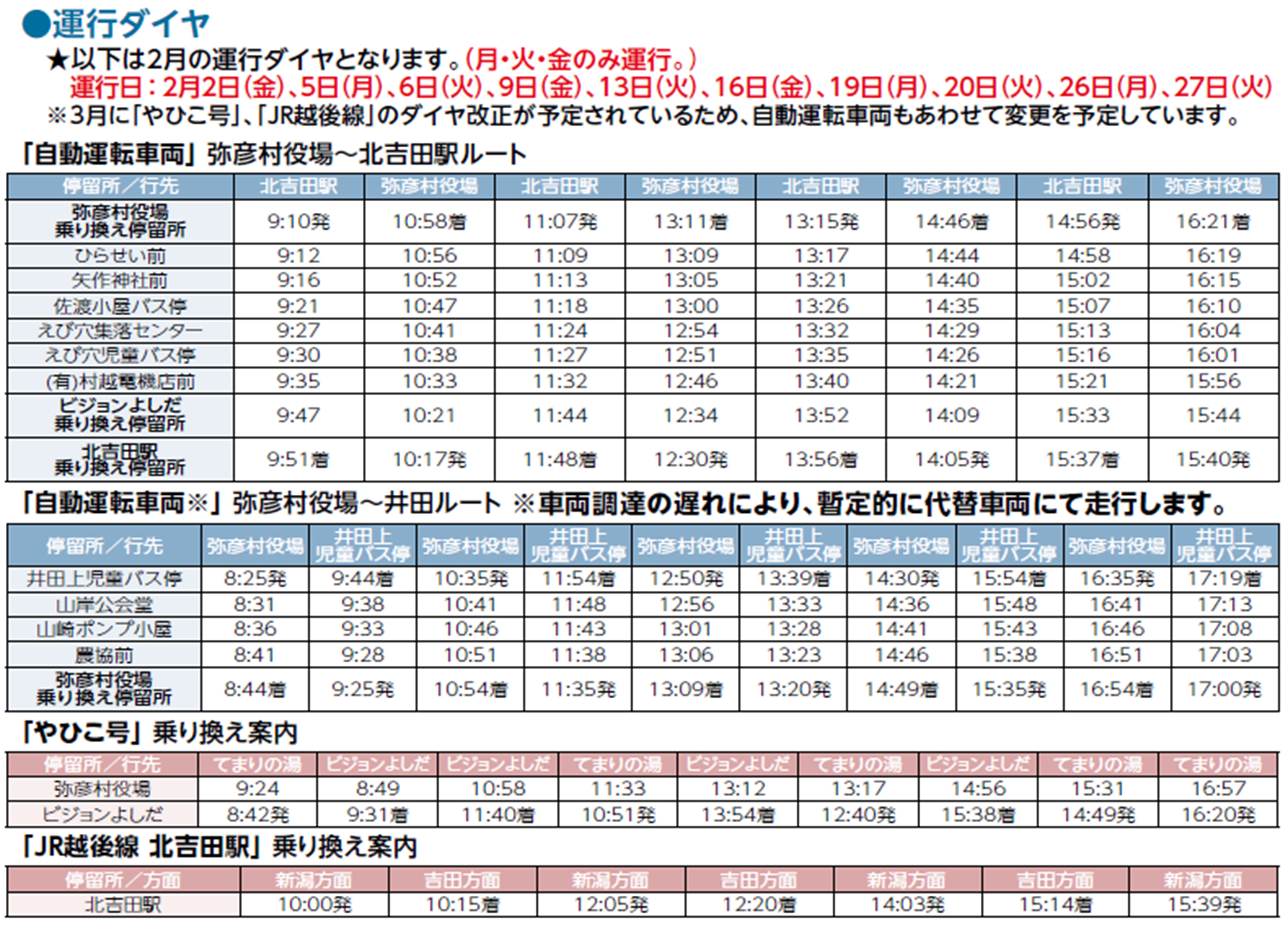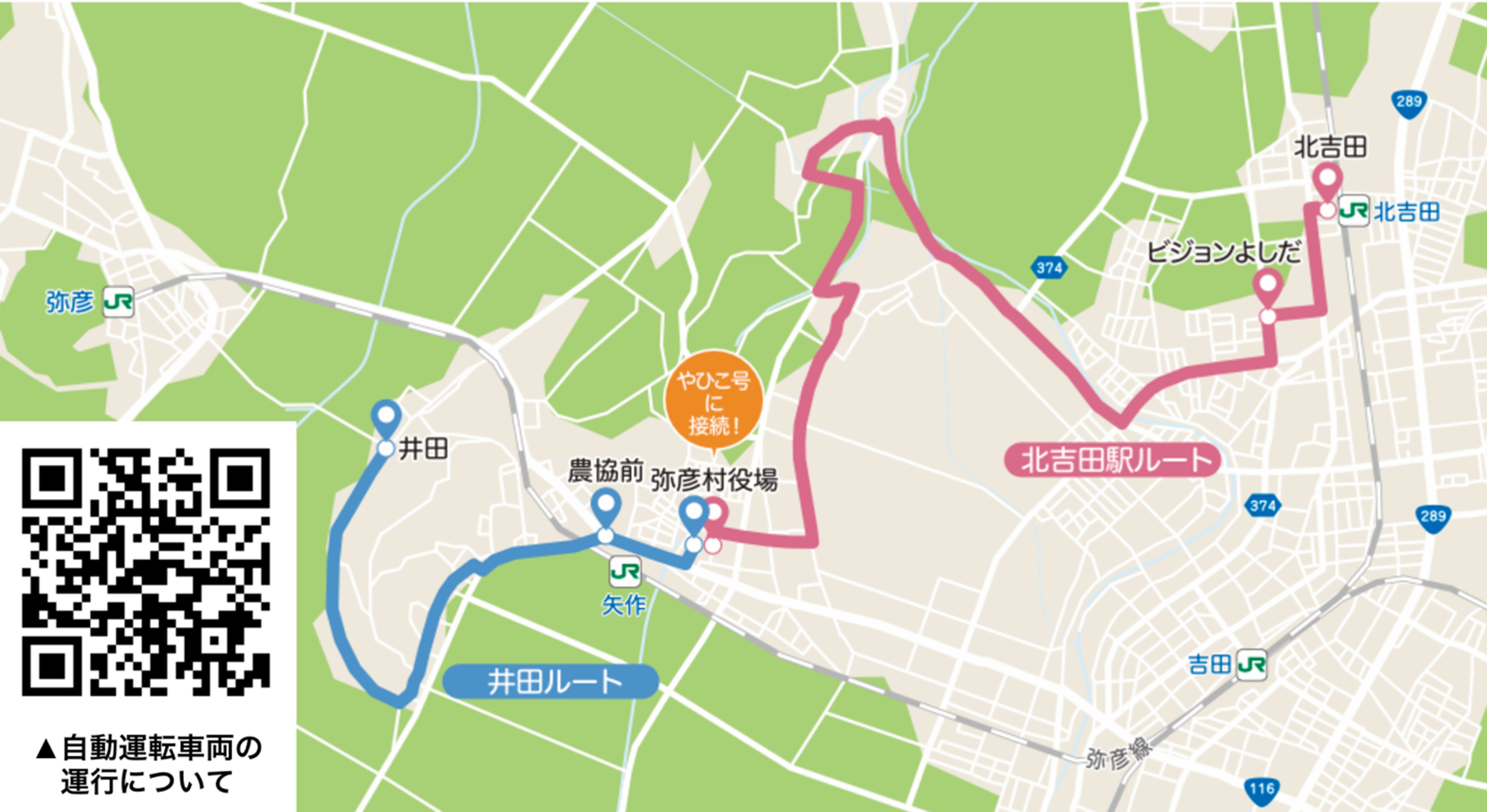 - 「MiCa」は、弥彦村役場を起点とする北吉田ルート(片道約5.7km)と井田ルート(片道約2.5km)の2つのルートを走行します。どちらのルートも住宅地などを通り、弥彦村役場のバス停で「やひこ号」に接続します。また、北吉田ルートでは「北吉田駅」のバス停でJR北吉田駅に接続します。