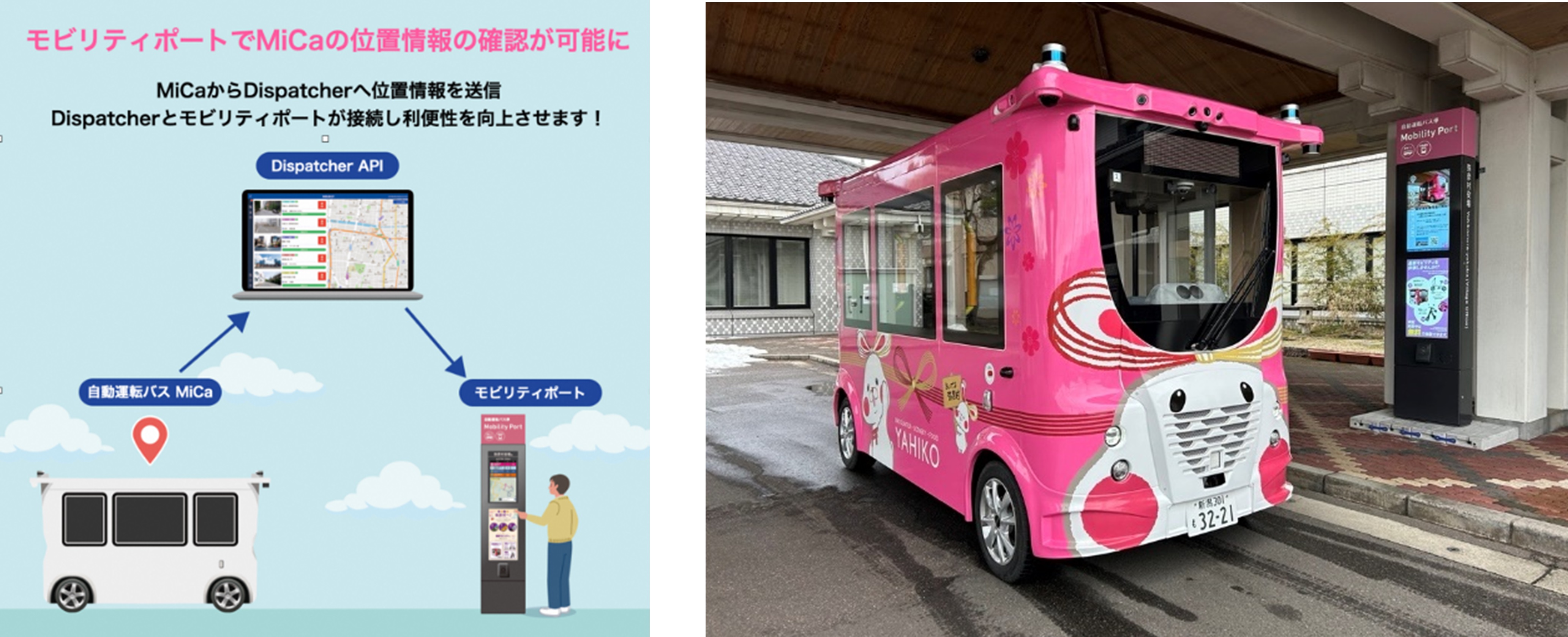 (左)モビリティポートのシステム概念図 (右)弥彦村役場の前に設置したモビリティポートと「MiCa」