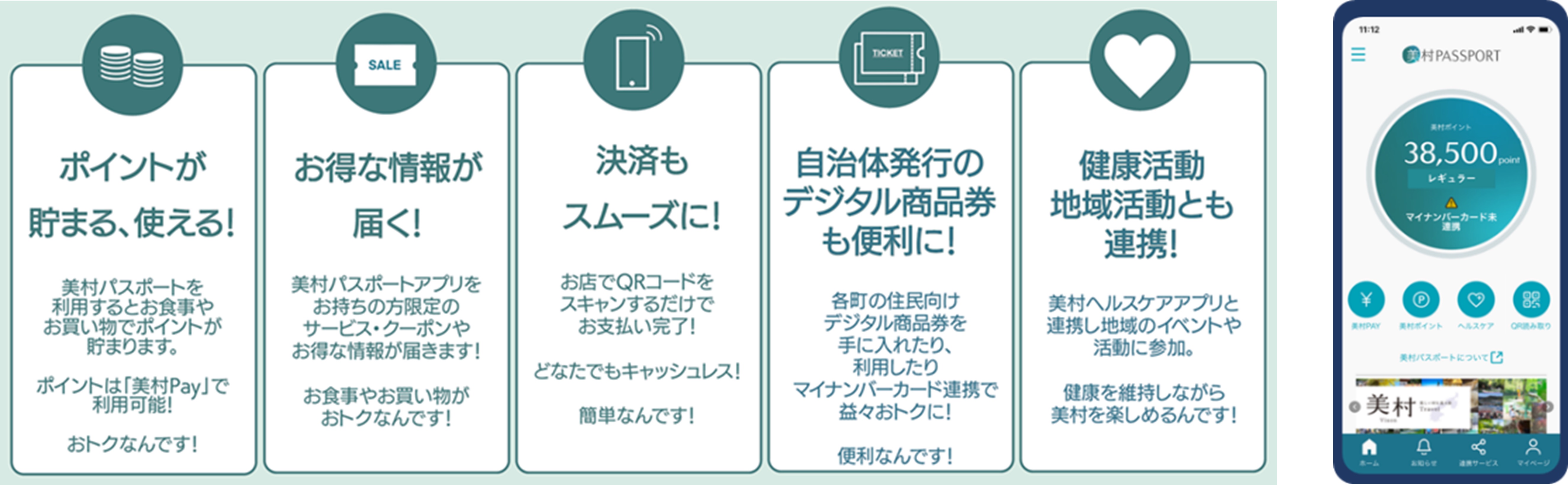 (1)地域のお得な周遊アプリ「美村パスポート」 地域の魅力的なスポットをより楽しく・お得に周遊できるスマートフォン用アプリです。各種デジタルサービスとの連動や、マイナンバーカードの認証機能の活用によって、住民向けや観光客向けの限定サービスを提供するなど、新たなDX(デジタルトランスフォーメーション)の取り組みを推進します。