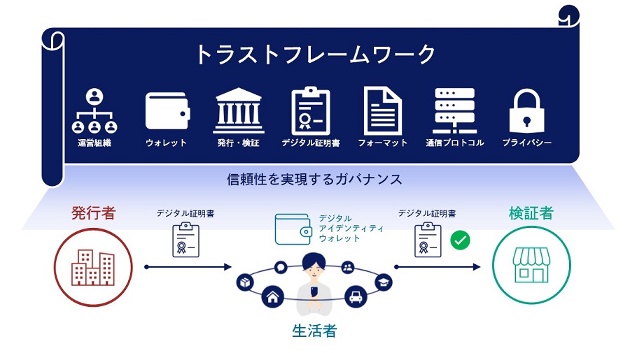 その結果、インターネット上の新たな信頼の枠組み(トラストフレームワーク)を構築するイニシアティブである「Trusted Web」を社会実装するには、運用しやすい技術に加え、国際間の相互運用やコンソーシアム(共同事業体)運営の際の要件等をルールとして定めたガバナンスが必要であることがわかりました。また、この実証実験を通じて、「共助」などの幅広いテーマで汎用的に活用できるトラストフレームワークを策定しました。